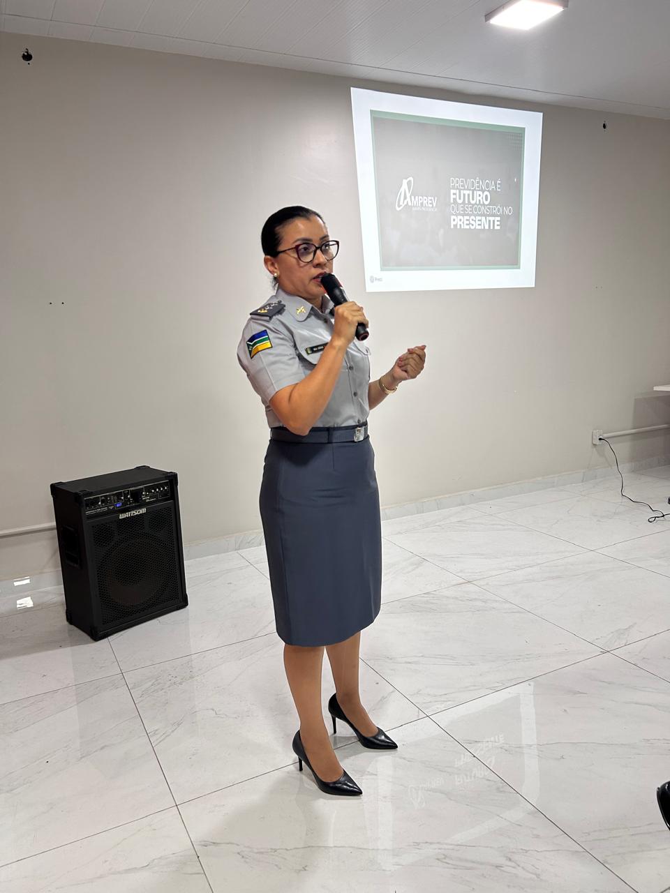 A palestra foi conduzida pela equipe da Diretoria de Benefícios Militares (DIBEM), composta pela Major Sônia Priscila (diretora da DIBEM), Capitã Francilene Nascimento e Sargento Edivaldo Pantoja, que apresentaram orientações sobre checklist de documentos, abertura de processos, reserva remunerada e pensão por morte. A diretora Major Sônia, falou da palestra.